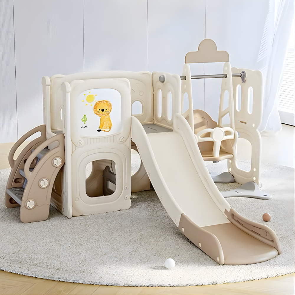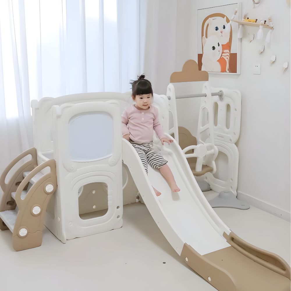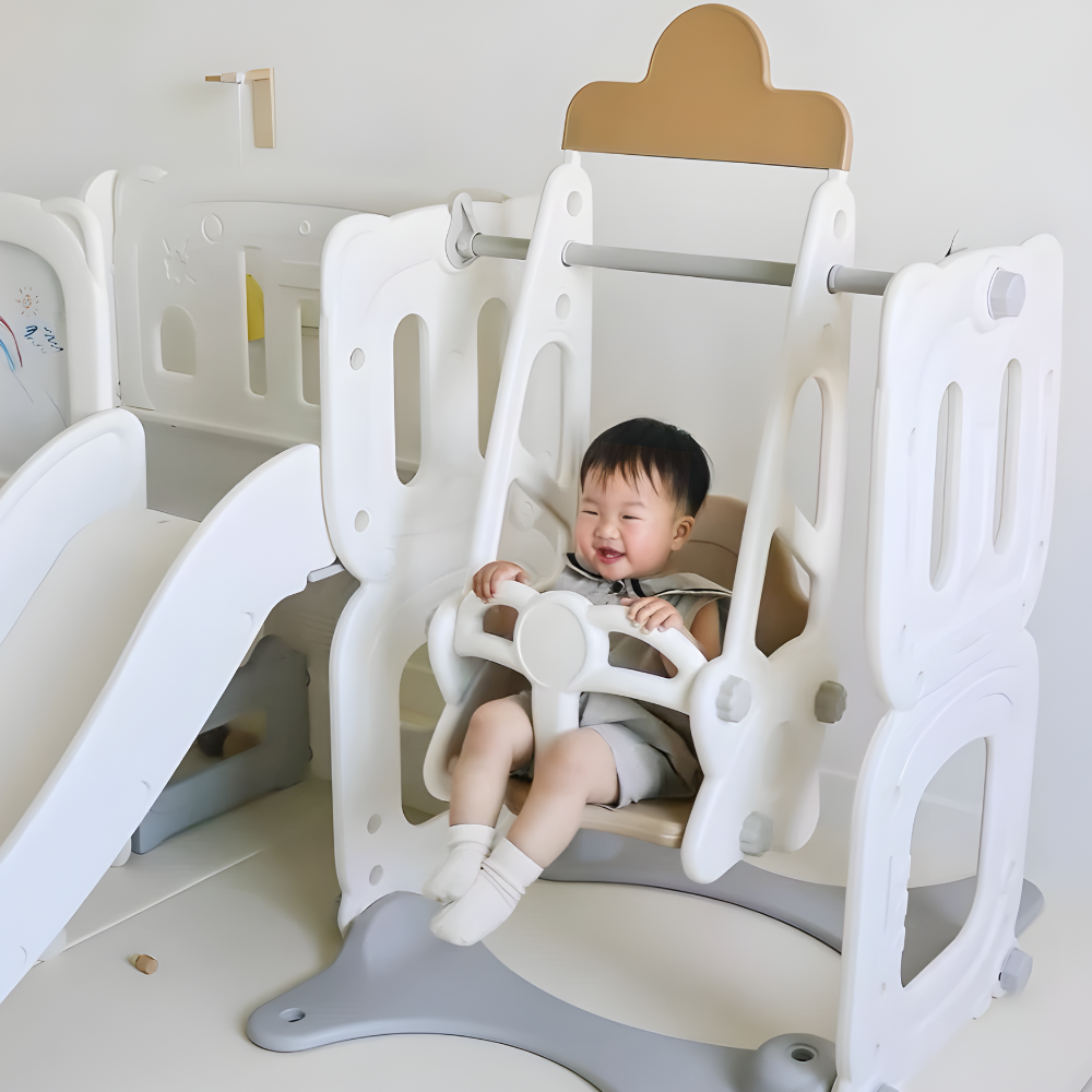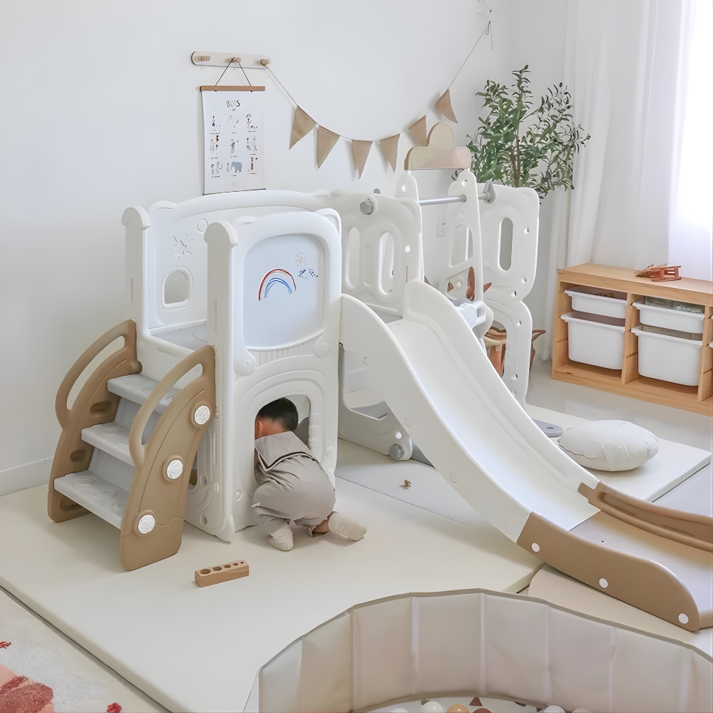 - Bộ cầu trượt – xích đu – bảng vẽ đa năng, màu trà sữa xinh xắn, decor phòng bé đẹp mắt