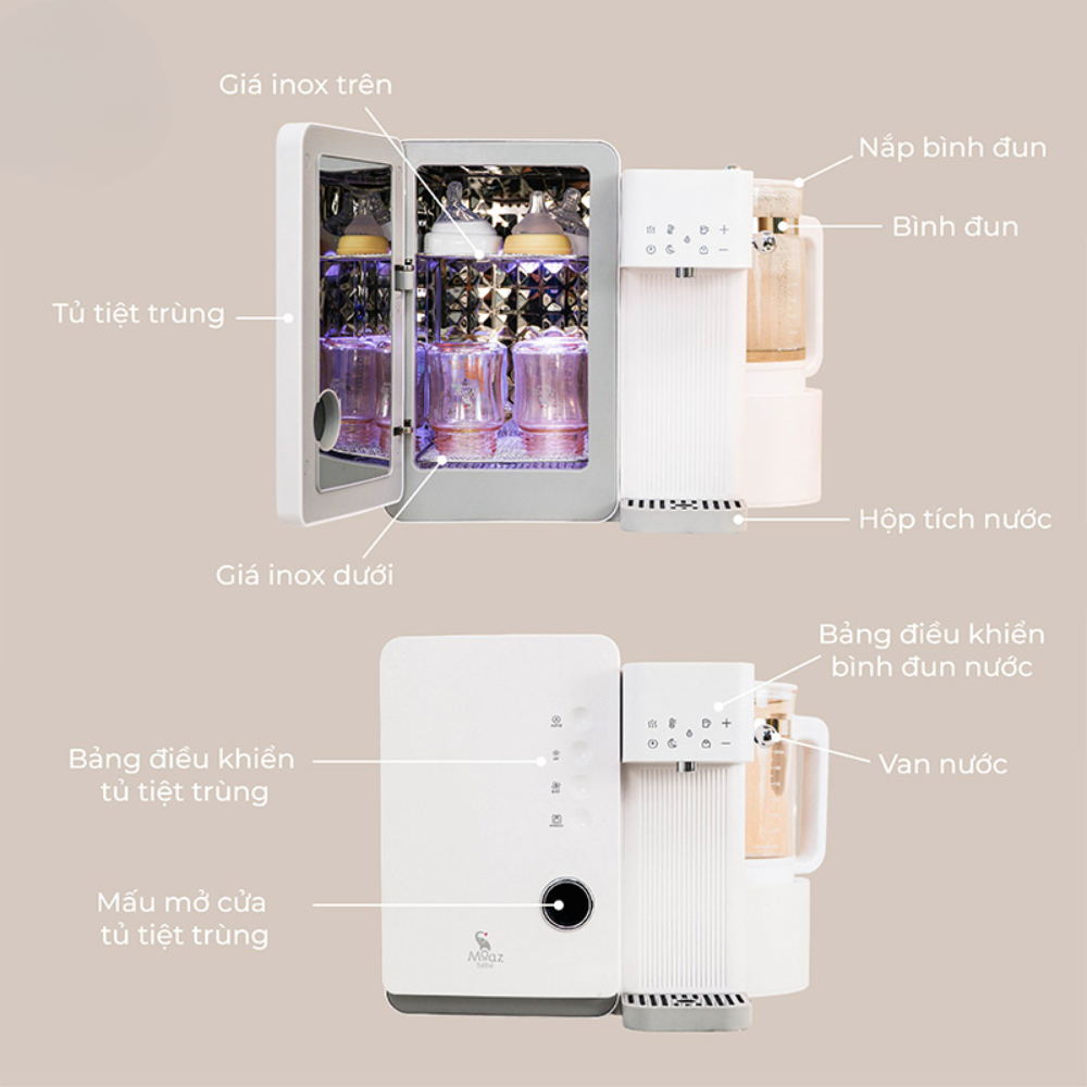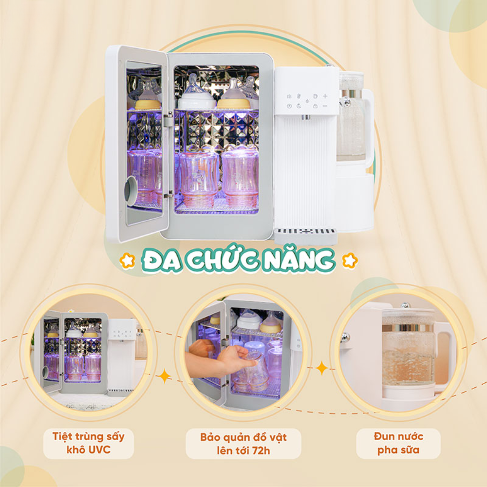 - Đa chức năng: Đun nước pha sữa, tiệt trùng UV, sấy khô, bảo quản đồ vật