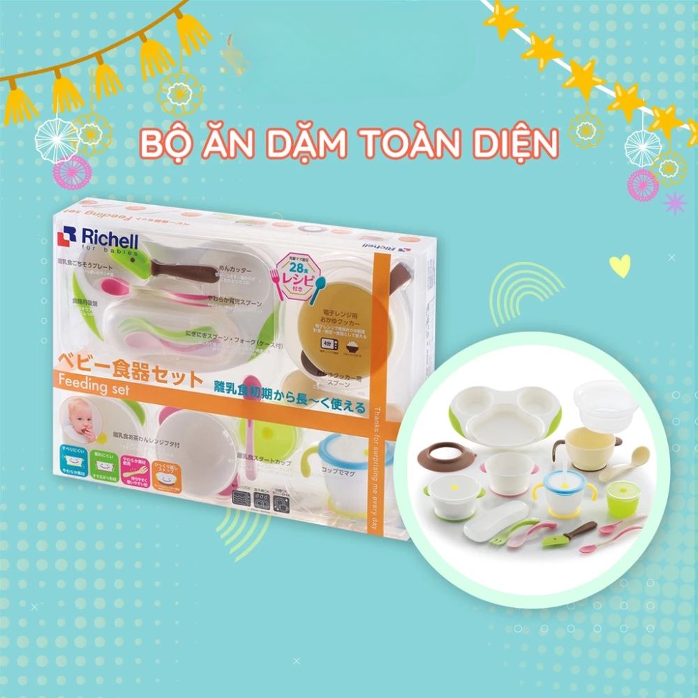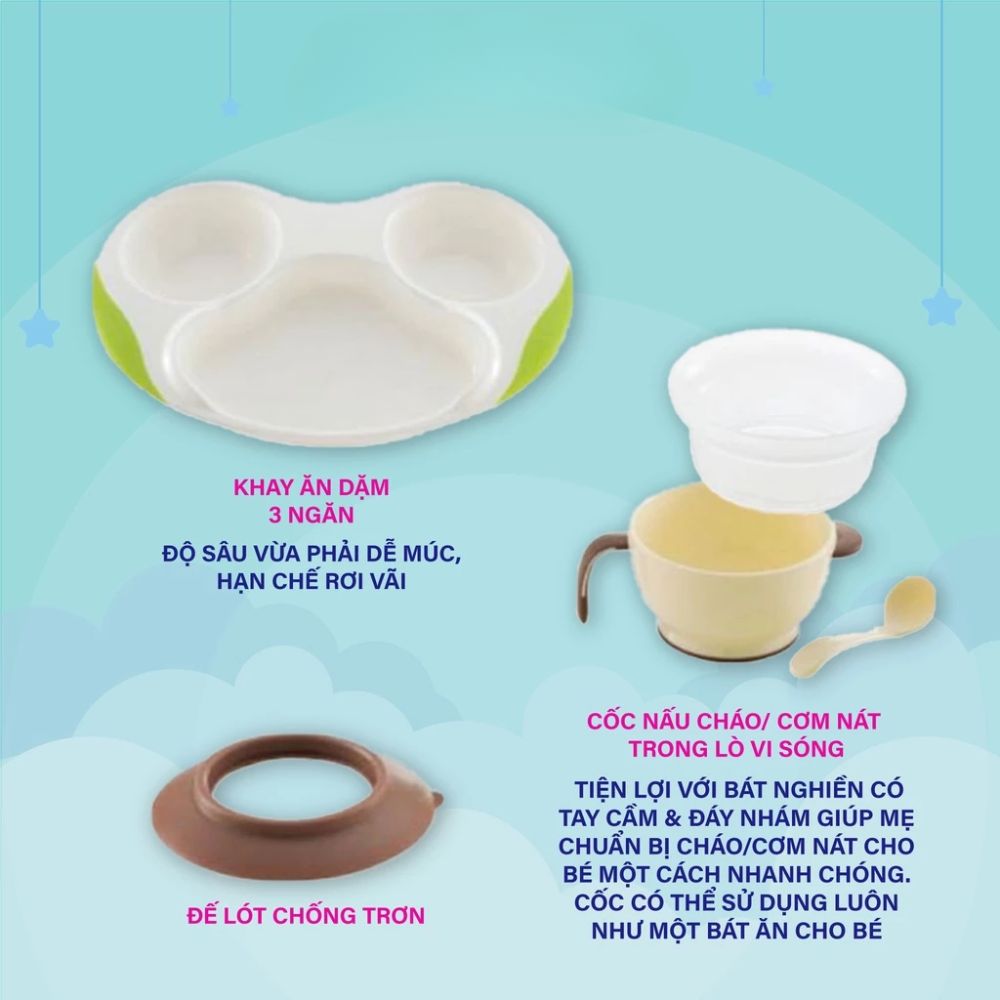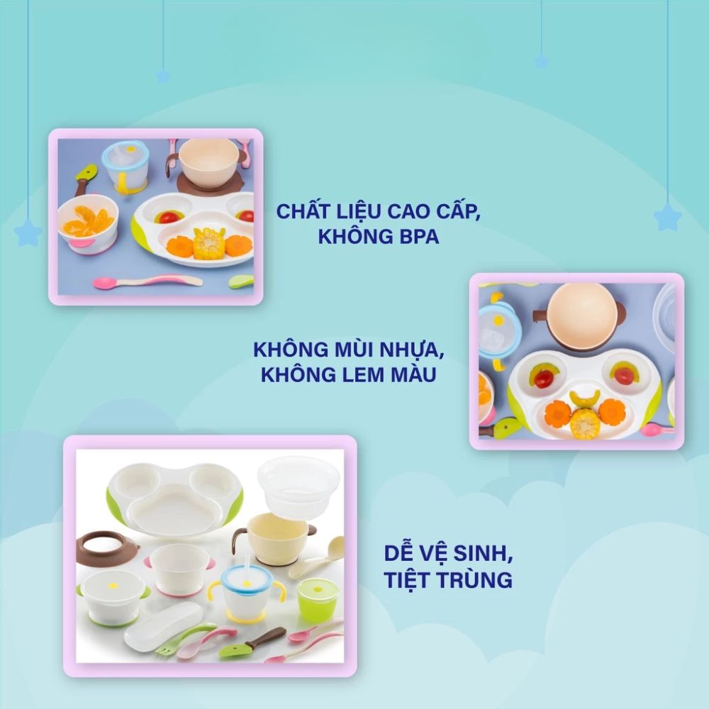 - Bộ ăn dặm gồm 14 dụng cụ từ chất liệu nhựa PP an toàn, tiêu chuẩn Nhật Bản, không BPA, không mùi, dễ dàng vệ sinh, không lem màu, dễ dàng tiệt trùng và dùng được trong lò vi sóng.