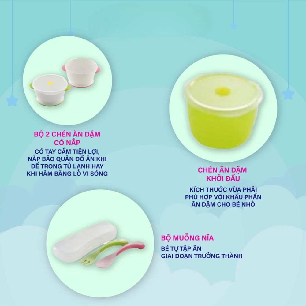- Bộ 2 chén ăn dặm có nắp có tay cầm tiện lợi, nắp bảo quản đồ ăn khi để trong tủ lạnh. Nắp có nút thông khí đảm bảo an toàn khi hâm bằng lò vi sóng.